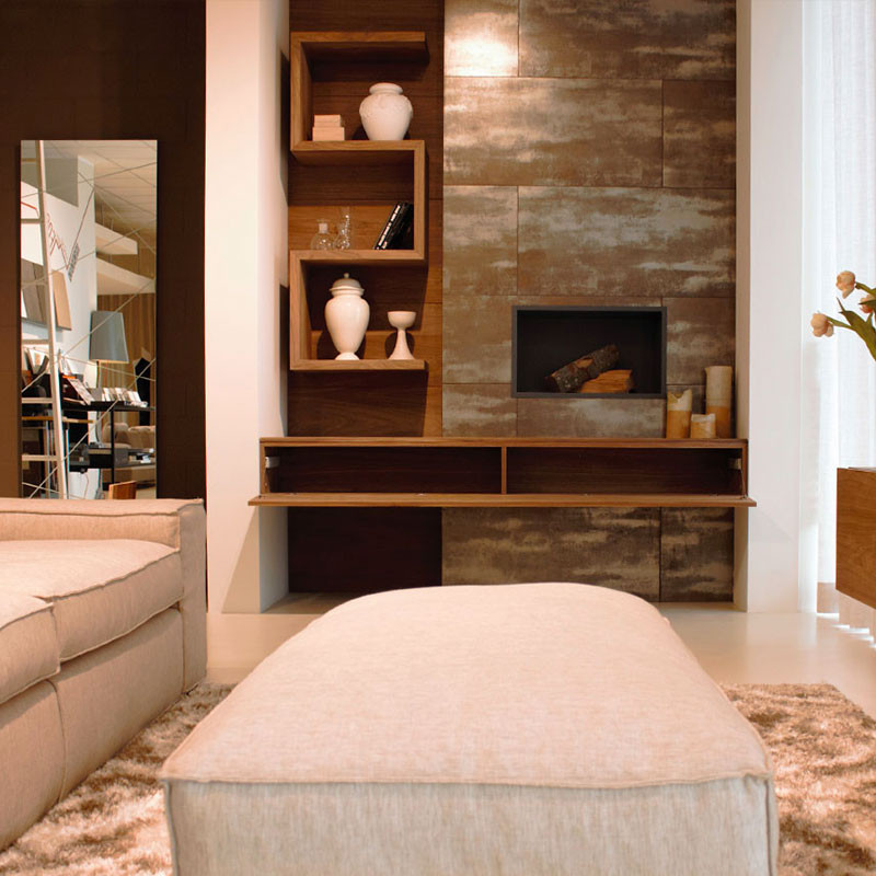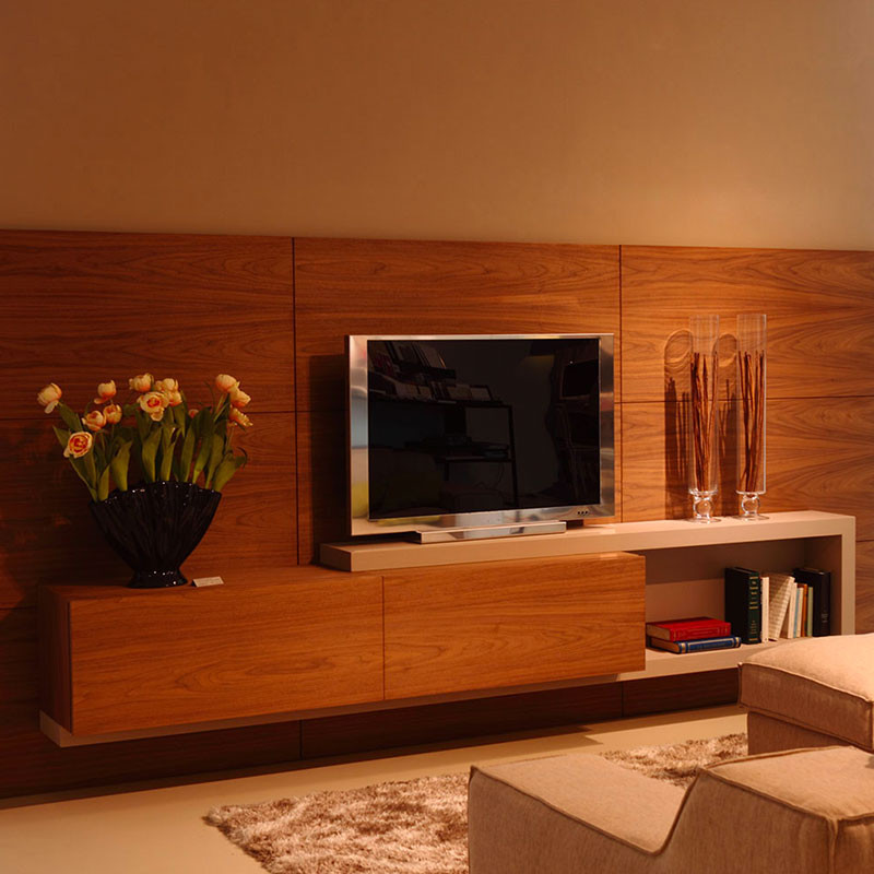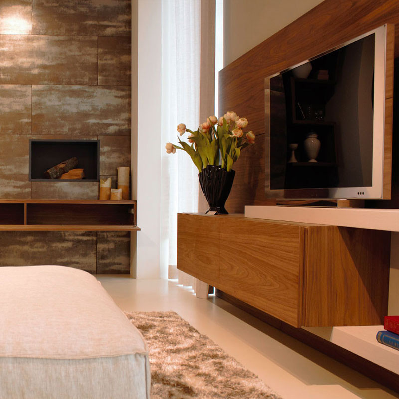 Composition in which the thick lacquered elements embrace the base fixed to the boiserie, creating a wide lounge. The suspended cabinet, with their extremely clean lines, are enriched by the shaped joint directly on the front edge of the same, which makes it easy to open the drawer fronts, intentionally without handles. Boiserie and cabinet units are in canaletto wood, oiled and worked in marble.