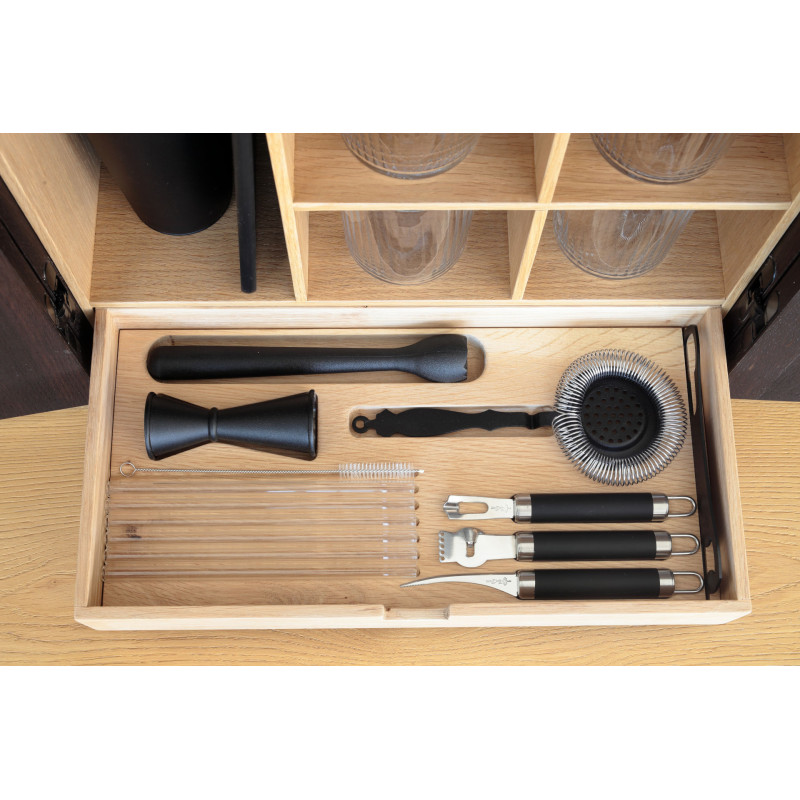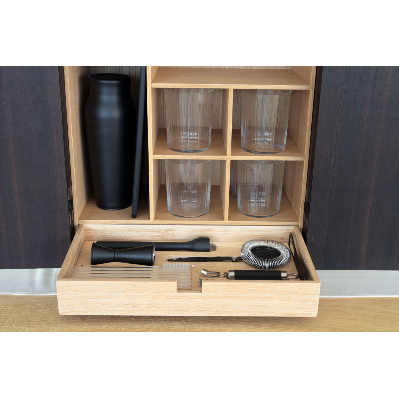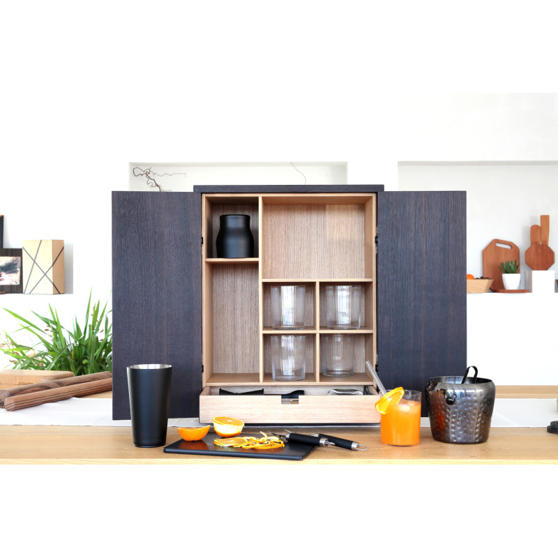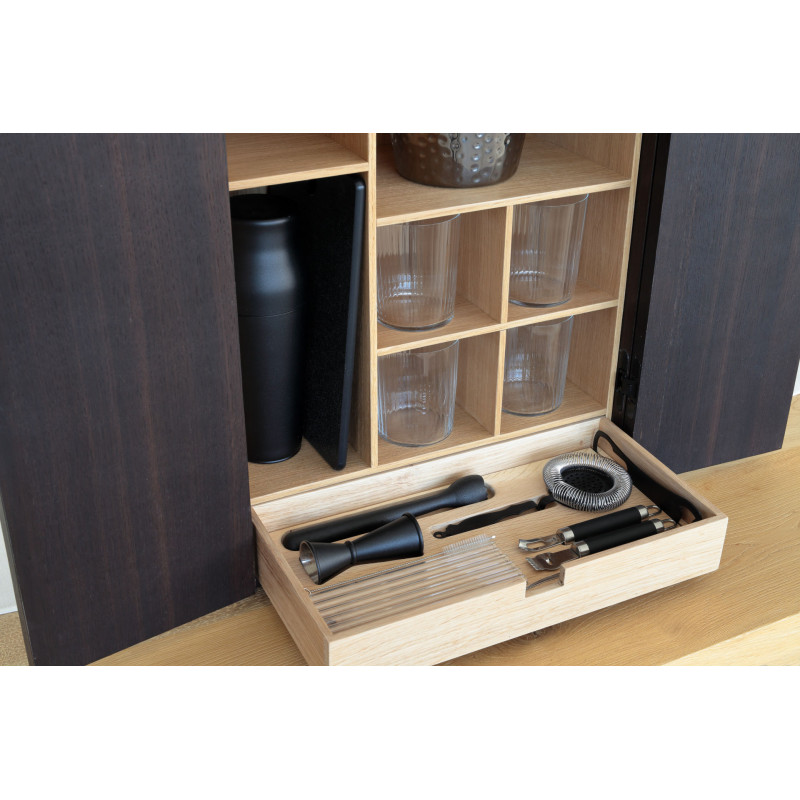 The Cocktail Bar Box is a refined cabinet designed to hold all the essential tools for cocktail preparation, combining functionality and elegance. High-quality materials: made of heat-treated oak on the outside for a sophisticated and deep look, the interior is made of bleached oak and creates a harmonious and refined contrast.